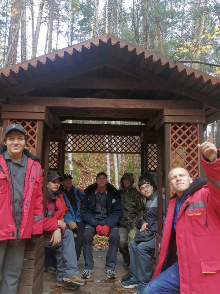 В рамках проекта наши ребята занялись очисткой территории от мусора, построили уютную беседку и уложили деревянный настил для удобства прогулок.