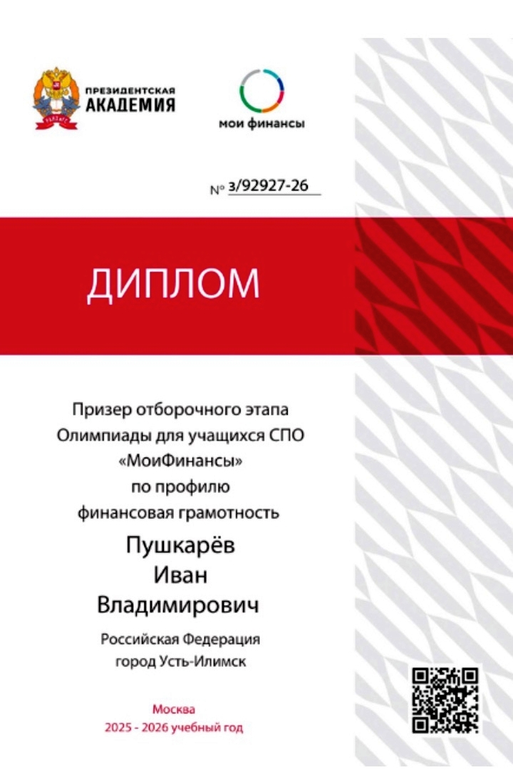 Студенты группы ТК-22 приняли участие в отборочном этапе олимпиады по финансовой грамотности «МоиФинансы», который проходил в онлайн-формате с 11 ноября по 24 декабря 2025 года.