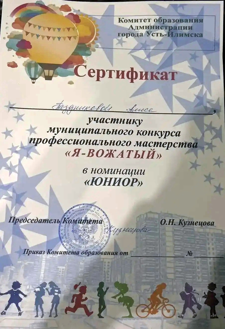 По итогам конкурса Алиса получила Сертификат об участии. Это не просто награда, а бесценный опыт и уверенный старт для будущих побед. Поздравляем и желаем не останавливаться на достигнутом!